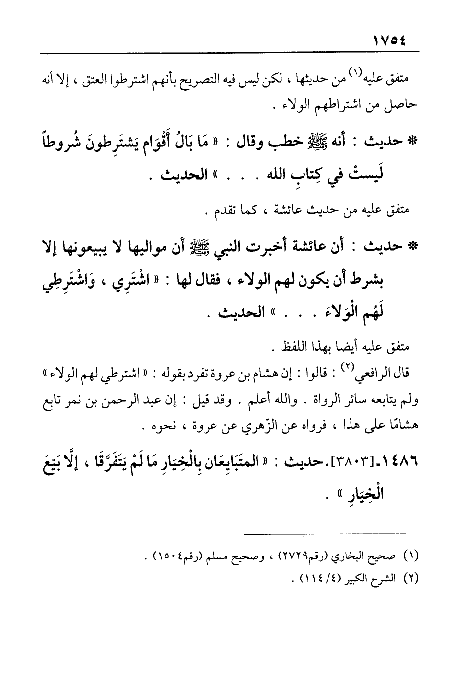* حديث: أن عائشة أخبرت النبي صلى الله عليه وسلم أن مواليها لا يبيعونها إلا بشرط أن يكون لهم الولاء، فقال لها: "اشْتَرِي، وَاشْتَرِطِي لَهُم الْوَلاءَ ... " الحديث.