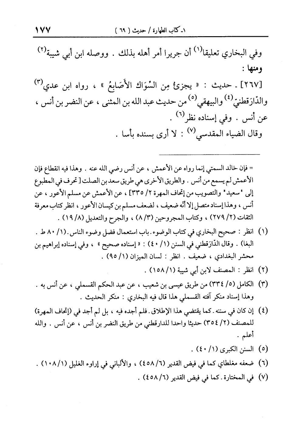 [267]- حديث: "يجزىءُ مِن السِّوَاك الأَصَابعُ"، رواه ابن عدي (¬3) والدّارَقطني (¬4) والبيهقي (¬5) من حديث عبد الله بن المثنى، عن النضر بن أنس، عن أنس. وفي إسناده نظر (¬6).