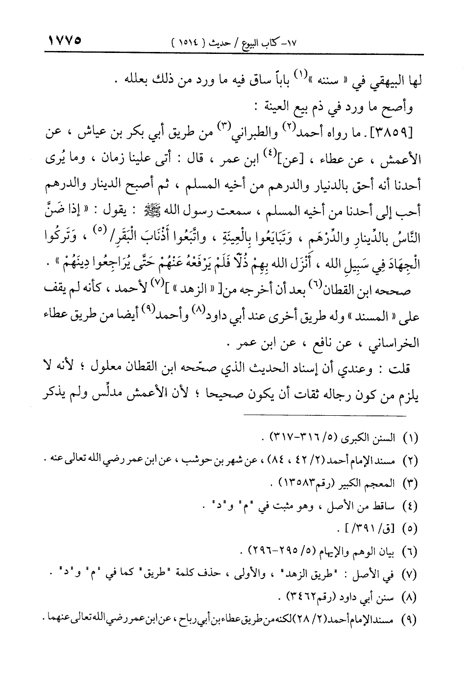 [3859]- ما رواه أحمد (¬2) والطبراني (¬3) من طريق أبي بكر بن عياش، عن الأعمش، عن عطاء، [عن] (¬4) ابن عمر، قال: أتى علينا زمان، وما يُرى أحدنا أنه أحق بالدنيار والدرهم من أخيه المسلم، ثم أصبح الدينار والدرهم أحب إلى أحدنا من أخيه المسلم، سمعت رسول الله صلى الله عليه وسلم يقول: "إذا ضَنَّ النَّاسُ بالدِّينارِ والدِّرْهَم، وَتَبَايَعُوا بِالْعِينَةِ، واتَّبَعُوا أَذْنَابَ الْبَقَرِ (¬5)، وَتَركوا الْجِهَادَ في سَبِيلِ الله، أَنْزَل الله بِهِمْ ذُلًّا فَلَمْ يَرْفَعْهُ عَنْهُمْ حَتَّى يُرَاجِعُوا دِينَهُمْ".