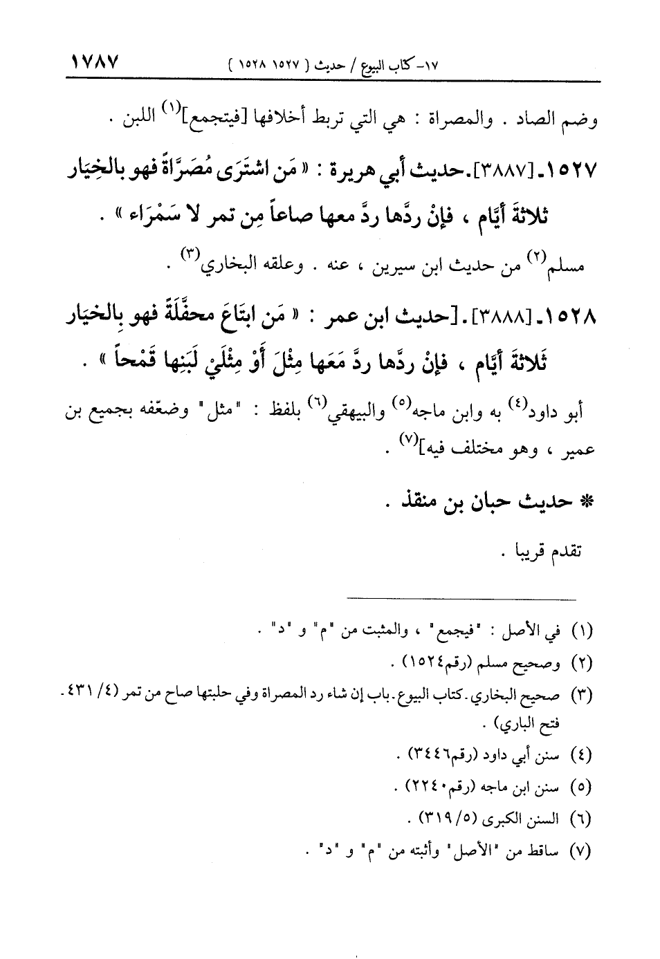 1528 - [3888]-[حديث ابن عمر: "مَن ابتَاعَ محفَّلَةً فهو بِالخيَار ثَلاثةَ أيَّام، فإنْ ردَّها ردَّ مَعَها مِثْلَ أَوْ مِثْلَي لَبَنِها قَمْحًا".