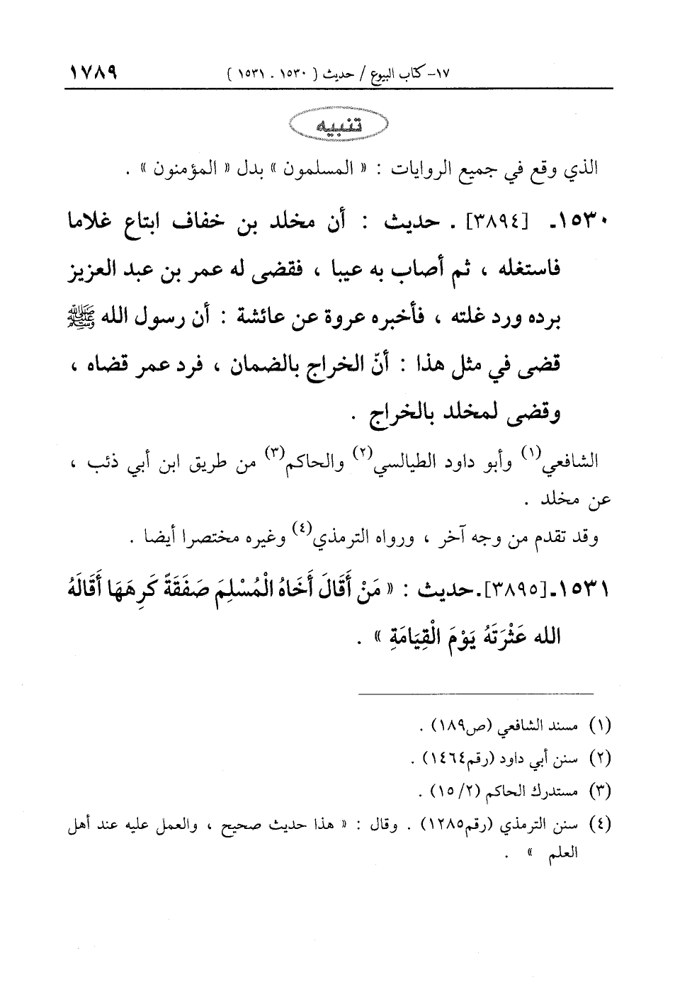1530 - [3894]- حديث: أن مخلد بن خفاف ابتاع غلاما فاستغله، ثم أصاب به عيبا، فقضى له عمر بن عبد العزيز برده ورد غلته، فأخبره عروة عن عائشة: أن رسول صلى الله عليه وسلم قضى في مثل هذا: أنّ الخراج بالضمان، فرد عمر قضاه، وقضى لمخلد بالخراج.