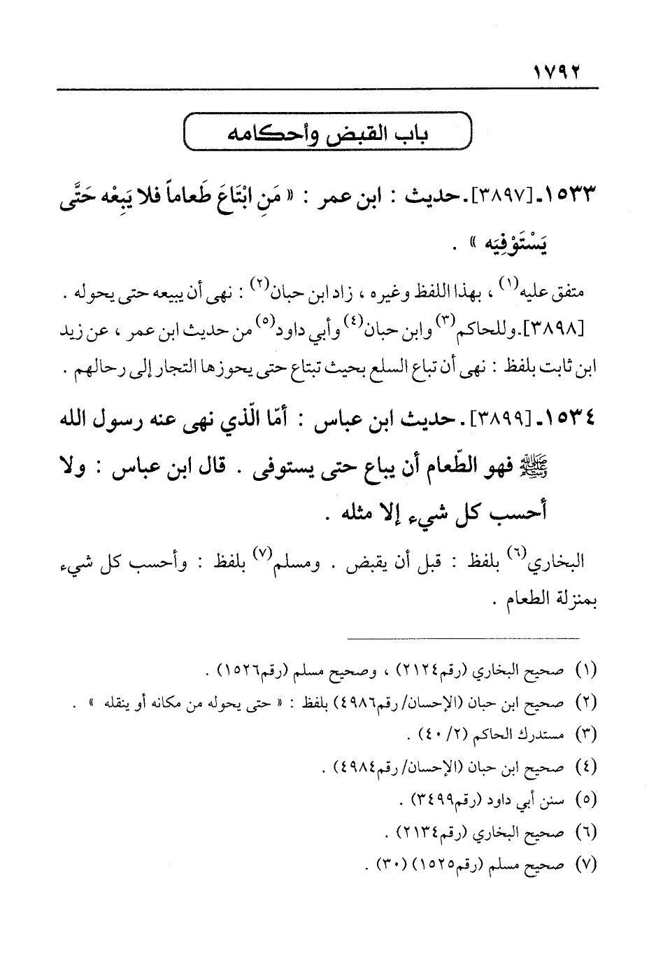 1533 - [3897]- حديث: ابن عمر: "مَنِ ابْتَاعَ طَعامًا فلا يَبِعْه حَتَّى يَسْتَوْفِيَه".