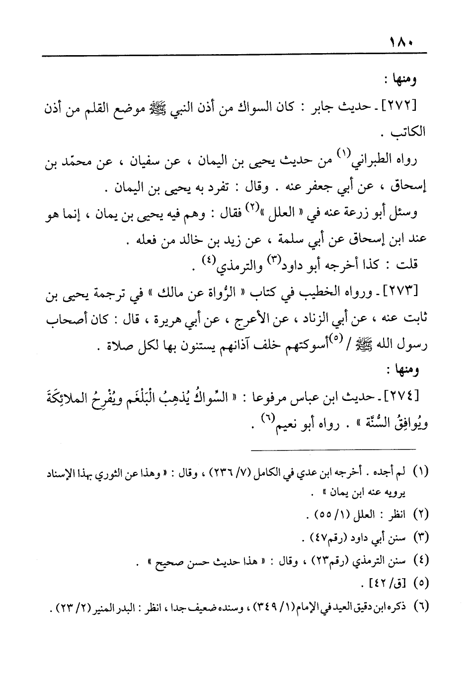 [274]- حديث ابن عباس مرفوعا: "السِّواكُ يُذهِبُ الْبَلْغَم ويُفْرِحُ الملائِكَةَ وُيوافِقُ السُّنَّة". رواه أبو نعيم (¬6).
