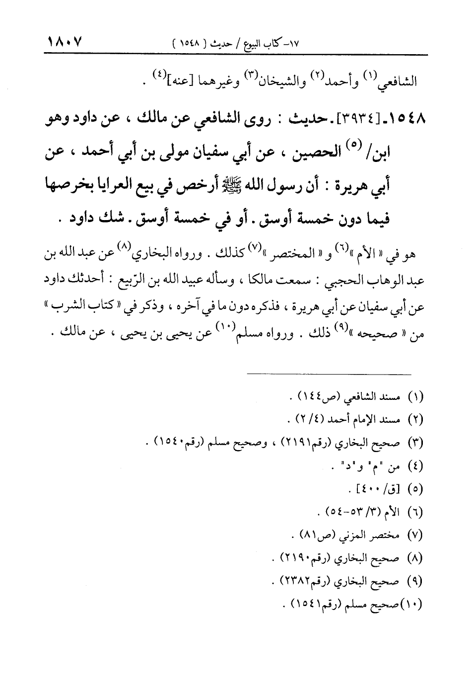 1548 - [3934]- حديث: روى الشافعي عن مالك، عن داود وهو ابن (¬5) الحصين، عن أبي سفيان مولى بن أبي أحمد، عن أبي هريرة: أن رسول الله - صلى الله عليه وسلم - أرخص في بيع العرايا بخرصها فيما دون خمسة أوسق -أو في خمسة أوسق- شك داود.