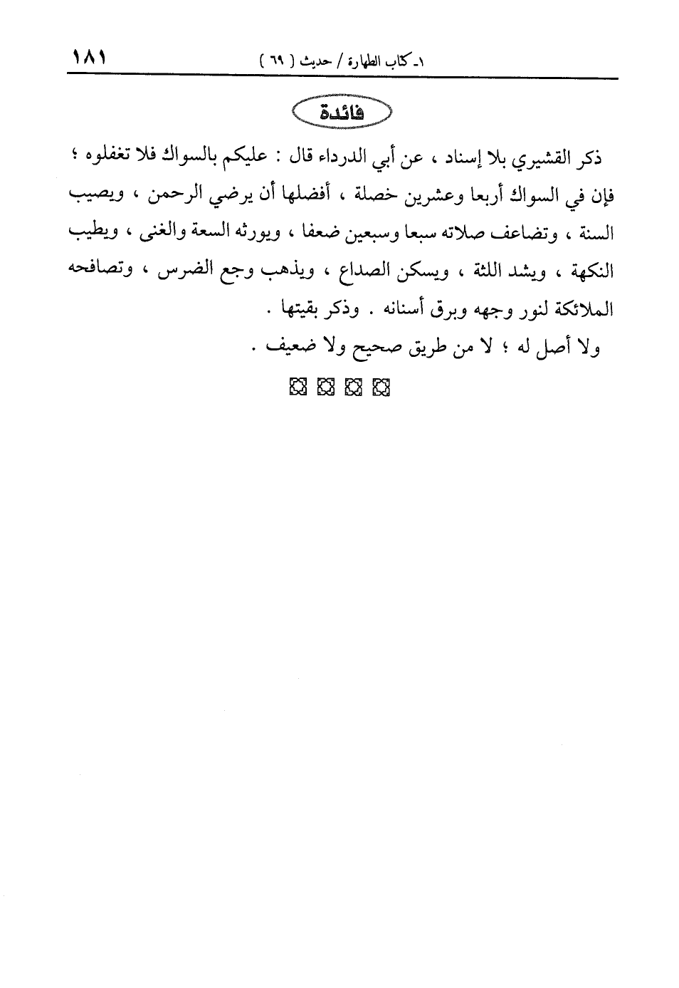 ذكر القشيري بلا إسناد، عن أبي الدرداء قال: عليكم بالسواك فلا تغفلوه؛ فإن في السواك أربعًا وعشرين خصلة، أفضلها أن يرضي الرحمن، ويصيب السنة، وتضاعف صلاته سبعا وسبعين ضعفا، ويورثه السعة والغنى، ويطيب النكهة، ويشد اللثة، ويسكن الصداع، ويذهب وجع الضرس، وتصافحه الملائكة لنور وجهه وبرق أسنانه. وذكر بقيتها.