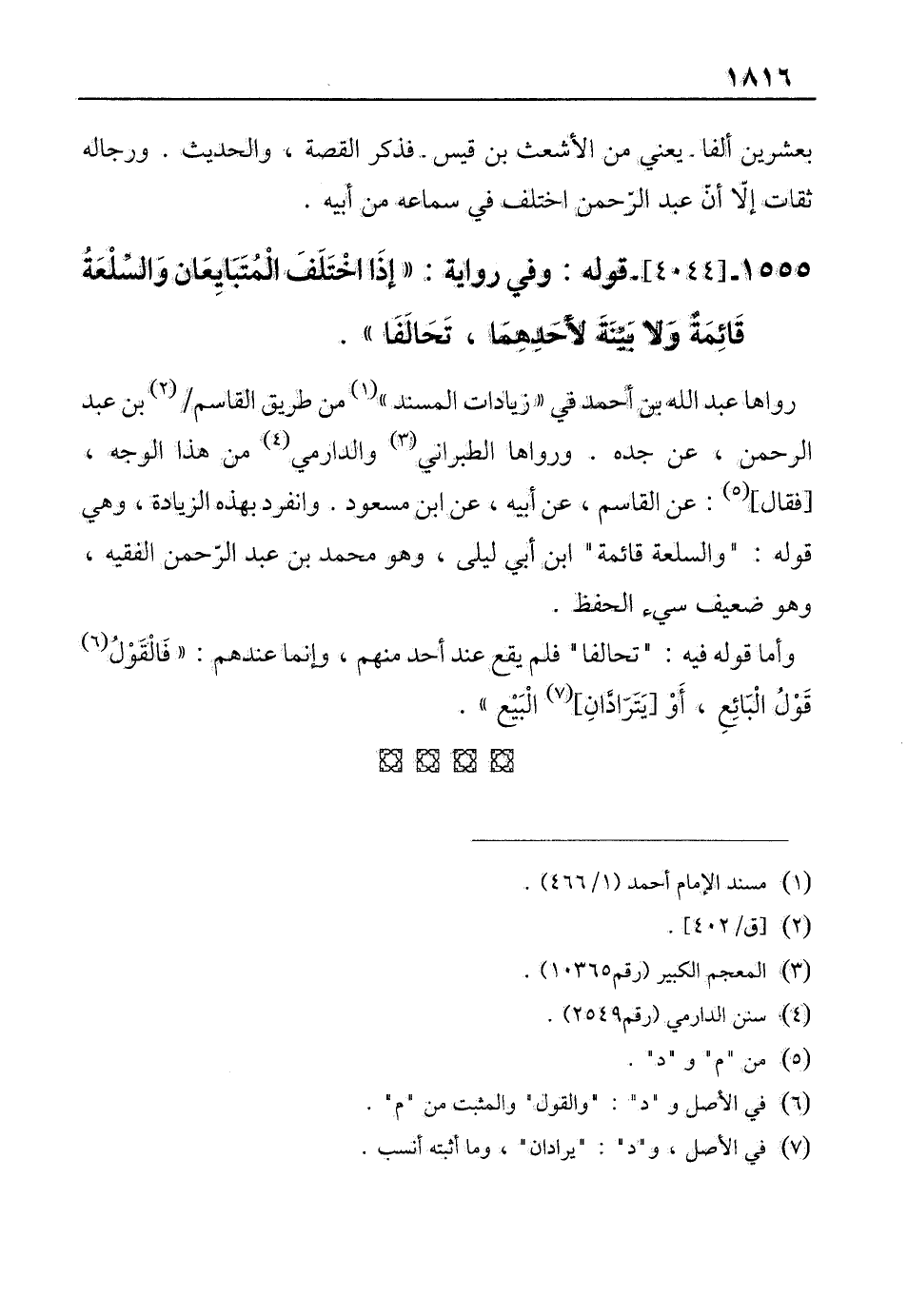 1555 - [4044]- قوله: وفي رواية: "إذَا اخْتَلَفَ الْمُتَبَايِعَان والسِّلْعَةُ قَائِمَةٌ ولا بَيِّنَةَ لأحَدِهِمَا، تَحَالَفَا".
