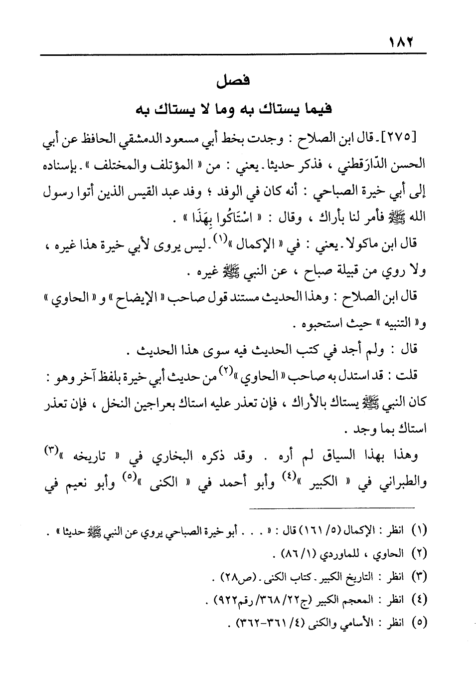 [275]- قال ابن الصلاح: وجدت بخط أبي مسعود الدمشقي الحافظ عن أبي الحسن الدّارَقطني، فذكر حديثا. يعني: من "المؤتلف والمختلف"- بإسناده إلى أبي خيرة الصباحي: أنه كان في الوفد؛ وقد عبد القيس الذين أتوا رسول الله - صلى الله عليه وسلم - فأمر لنا باراك، وقال: "اسْتَاكُوا بِهَذَا".