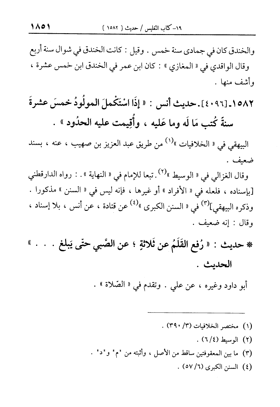 1582 - [4096]- حديث أنس: "إذَا اسْتَكْملَ المولُودُ خمسَ عشرةَ سنةً كُتب مَا لَه وما عَليه، وأُقِيمت عليه الحدُود".