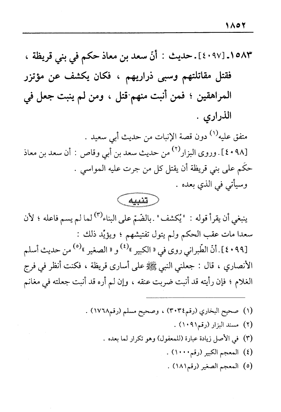 1583 - [4097]- حديث: أنّ سعد بن معاذ حكم في بني قريظة، فقتل مقاتلتهم وسبي ذراريهم، فكان يكشف عن مؤتزر المراهقين، فمن أثبت منهم قتل، ومن لم ينبت جعل في الذراري.
