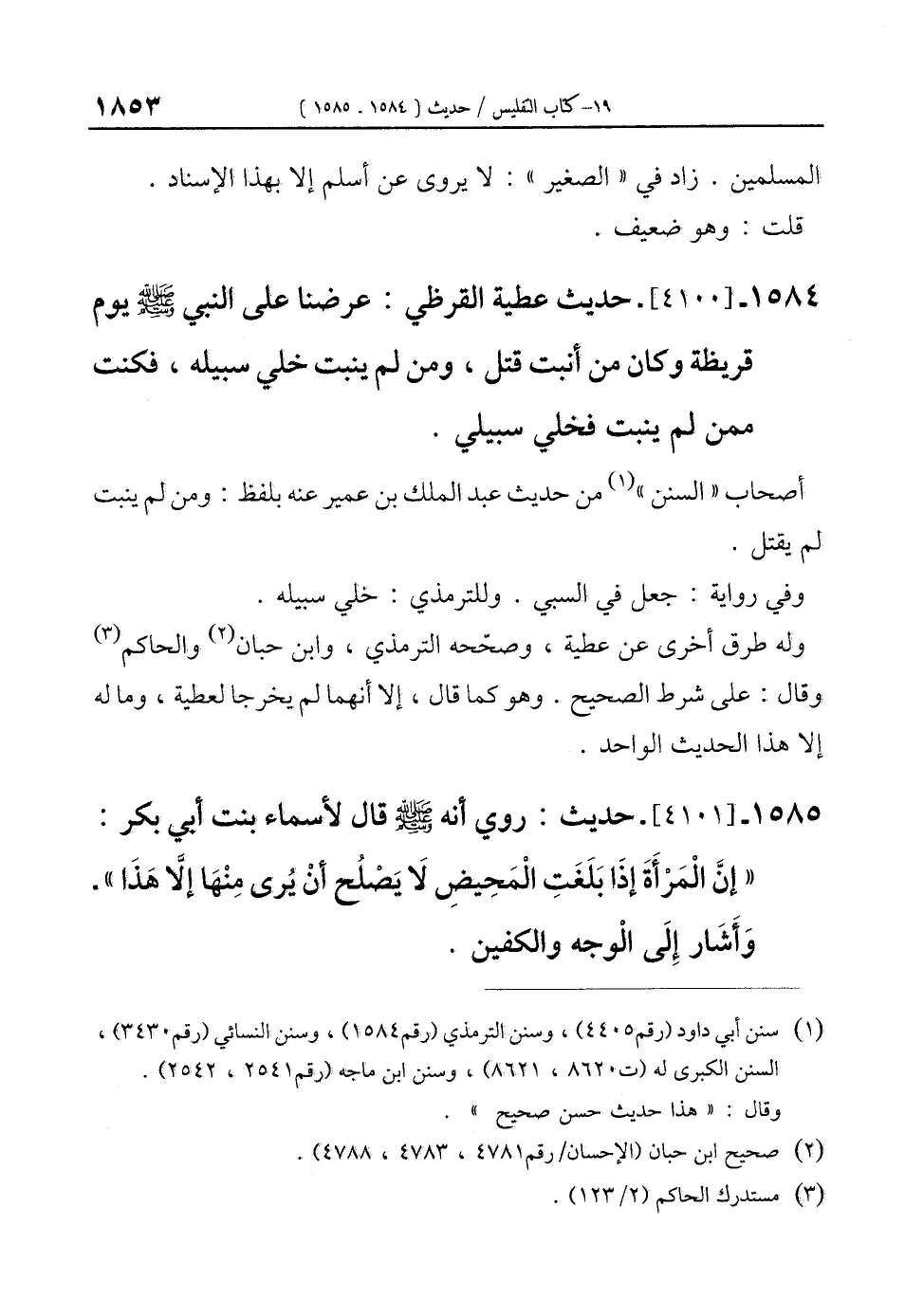 1584 - [4100]- حديث عطية القرظي: عرضنا على النبي - صلى الله عليه وسلم - يوم قريظة وكان من أنبت قتل، ومن لم ينبت خلي سبيله، فكنت ممن لم ينبت فخلي سبيلي.