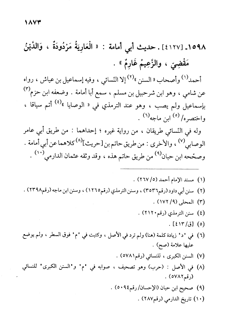 1598 - [4127]- حديث أبي أمامة: "الْعَارَيةُ مَرْدُودَهٌّ، وَالدَّيْنُ مَقْضِيّ، والزَّعِيمُ غَارِمٌ".