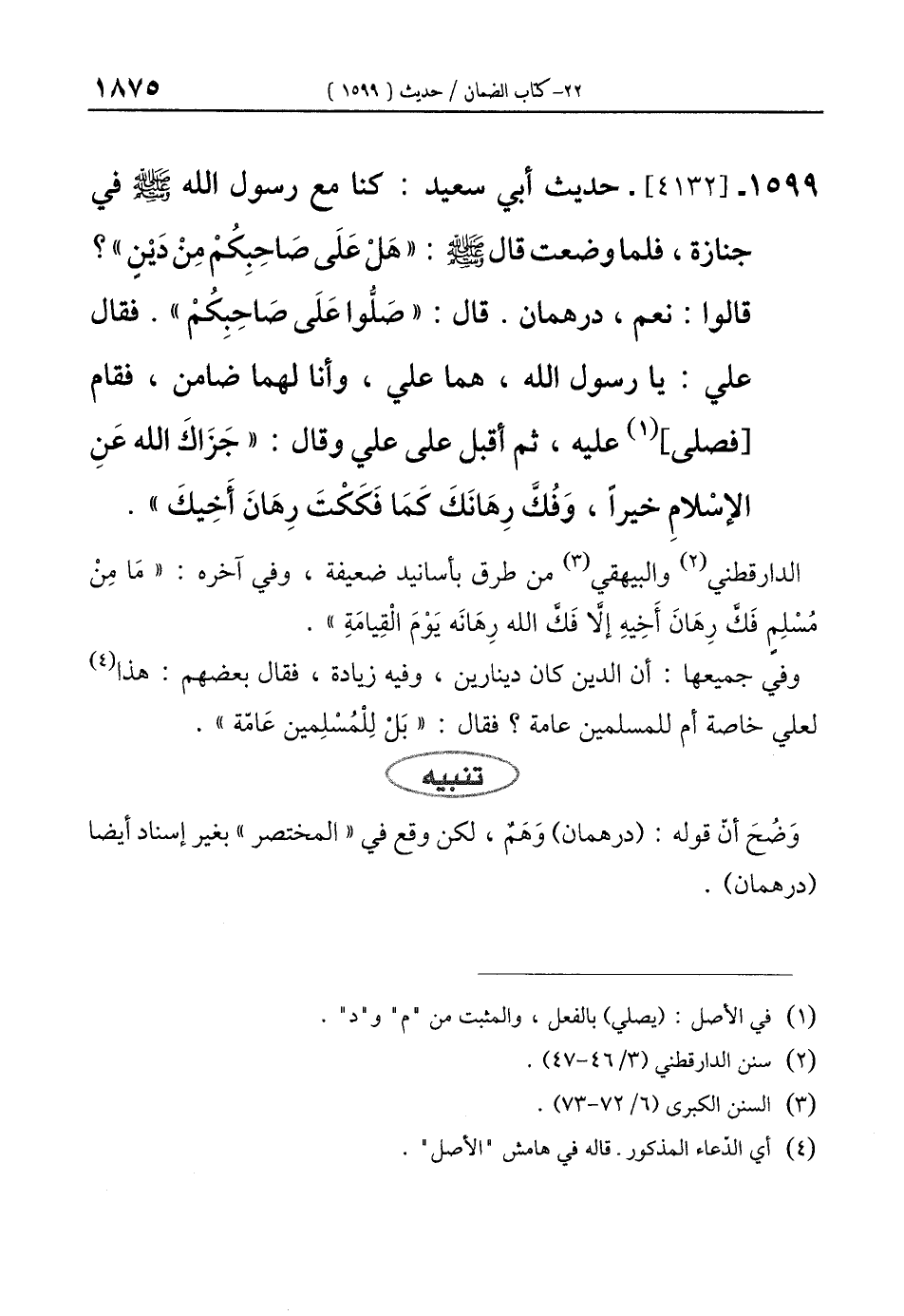 1599 - [4132]- حديث أبي سعيد: كنا مع رسول الله - صلى الله عليه وسلم - في جنازة، فلما وضعت قال: "هَلْ عَلَى صَاحِبِكُمْ مِنْ دَيْنٍ"؟ قالوا: نعم، درهمان. قال: "صَلُّوا عَلَى صَاحِبِكُمْ". فقال علي: يا رسول الله - صلى الله عليه وسلم -، هما علي، وأنا لهما ضامن، فقام [فصلى] (¬1) عليه، ثم أقبل على علي وقال: "جَزَاكَ الله عَنِ الإسْلامِ خيرًا، وَفُكَّ رِهَانَكَ كمَا فَكَكْتَ رِهَانَ أَخِيكَ".
