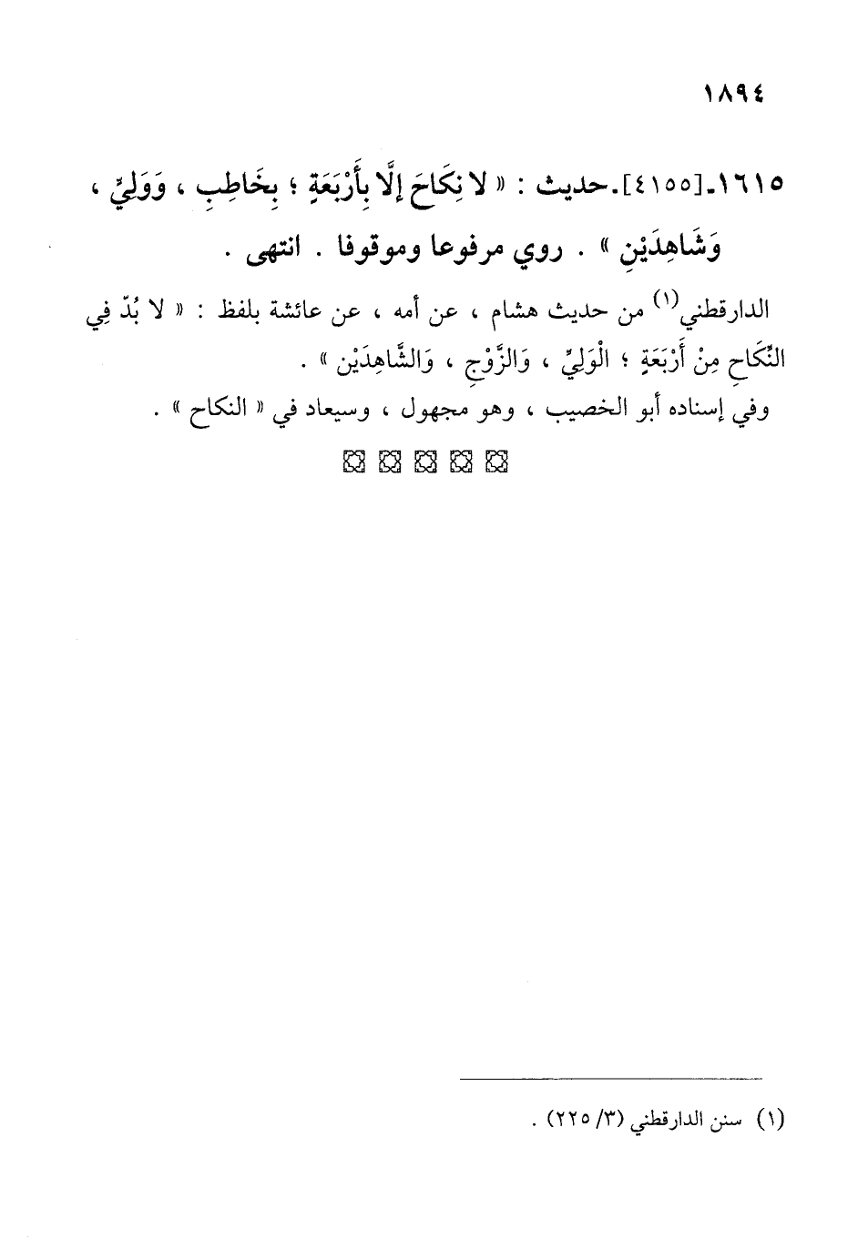 1615 - [4155]- حديث: "لا نِكَاحَ إلَّا بِأَرْبَعَةٍ؛ بِخَاطِبِ، وَوَلِيٍّ، وَشَاهِدَيْنِ". روي مرفوعا وموقوفًا. انتهى.