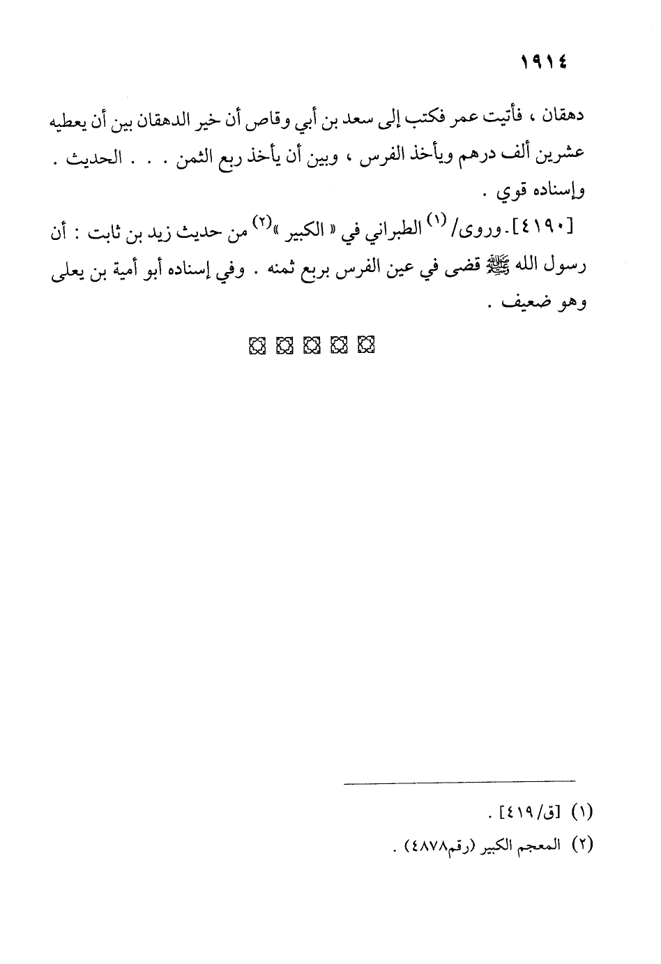 دهقان، فأتيت عمر فكتب إلى سعد بن أبي وقاص أن خير الدهقان بين أن يعطيه عشرين ألف درهم ويأخذ الفرس، وبين أن يأخذ ربع الثمن ... الحديث.