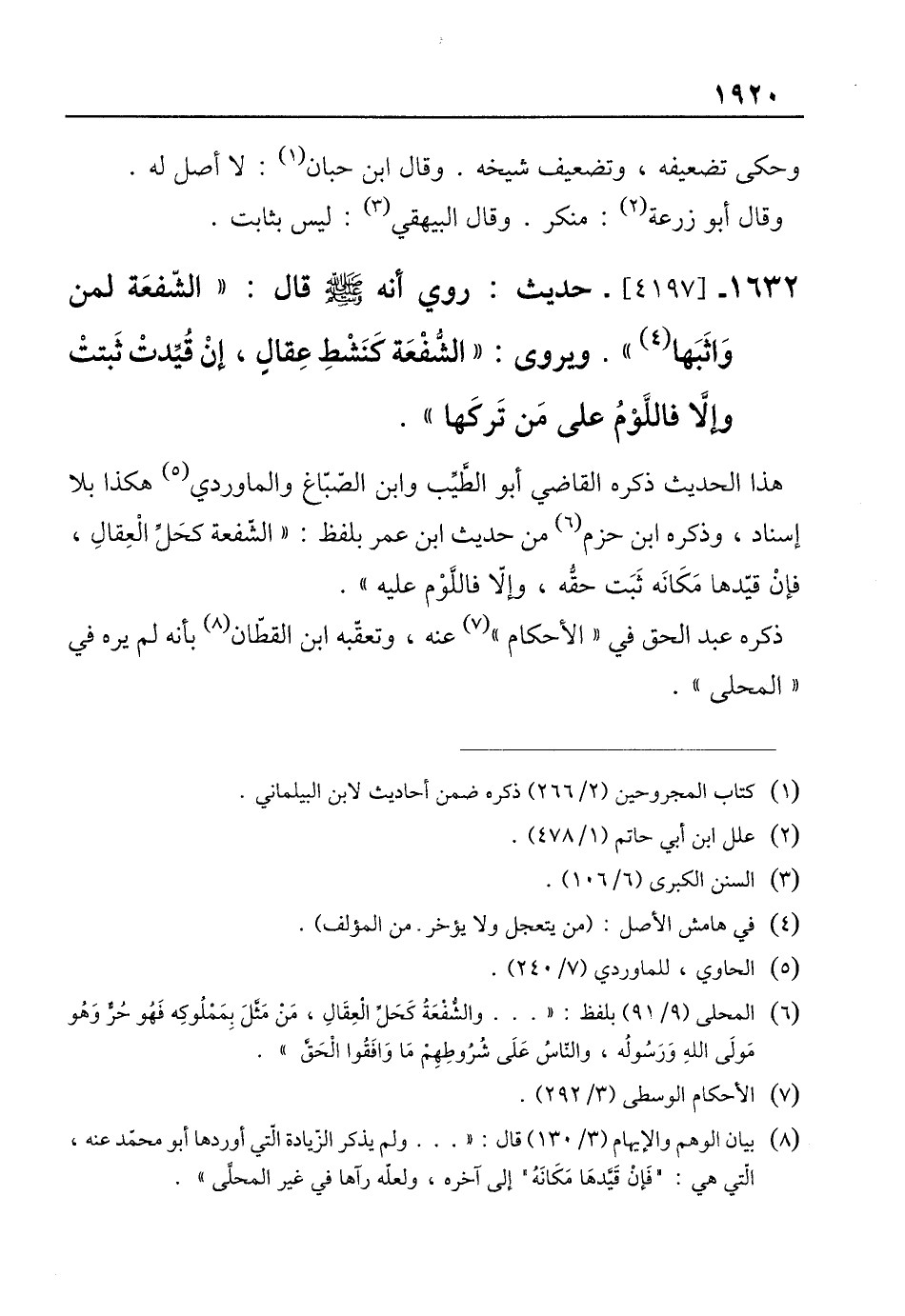 1632 - [4197]- حديث: روي أنه - صلى الله عليه وسلم - قال: "الشّفعَة لمن وَاثَبَها (¬4) ". ويروى: "الشُّفْعَة كنَشْطِ عِقالٍ، إنْ قُيِّدتْ ثَبتتْ وإلَّا فاللَّوْمُ على مَن تَركها".