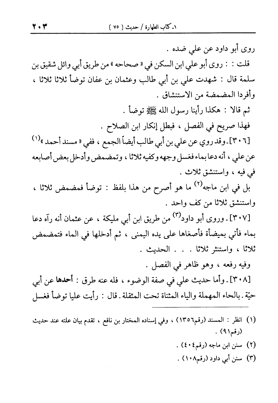 [307]- وروى أبو داود (¬3) من طريق ابن أبي مليكة، عن عثمان أنه رآه دعا بماء فأتي بميضأة فأصغاها على يده اليمنى، ثم أدخلها في الماء فتمضمض ثلاثا، واستنثر ثلاثا ... الحديث.