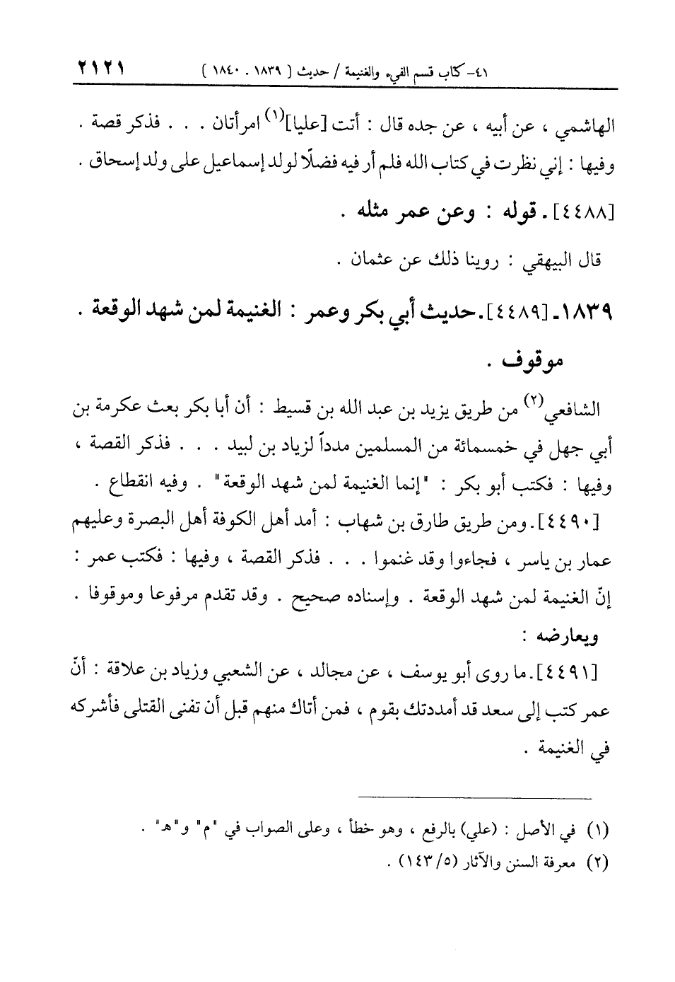 1839 - [4489]- حديث أبي بكر وعمر: الغنيمة لمن شهد الوقعة.