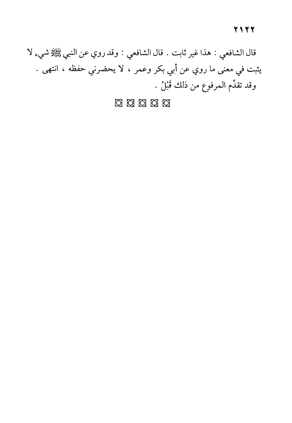 قال الشّافعي: هذا غير ثابت. قال الشّافعي: وقد روي عن النبي - صلى الله عليه وسلم - شيء لا يثبت في معنى ما روي عن أبي بكر وعمر، لا يحضرني حفظه، انتهى.