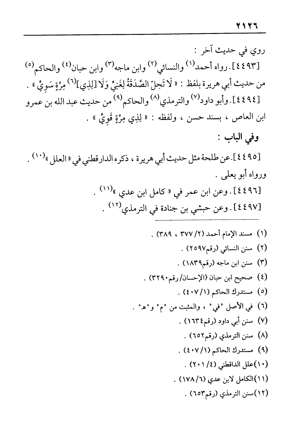 [4493]- رواه أحمد (¬1) والنسائي (¬2) وابن ماجه (¬3) وابن حبان (¬4) والحاكم (¬5) من حديث أبي هريرة بلفظ: "لَا تَحِلّ الصَّدَقَةُ لِغَنِيٍّ وَلَا [لِذِي] (¬6) مِرَّة سَوِي".