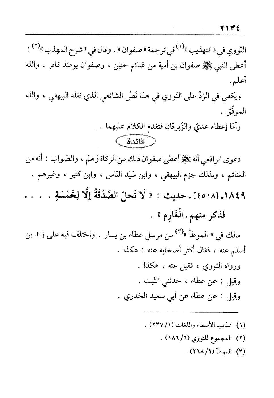 دعوى الرافعي أنه - صلى الله عليه وسلم - أعطى صفوان ذلك من الزكاة وَهمٌ، والصّواب: أنه من الغنائم، وبذلك جزم البيهقي، وابن سَيِّد الناس، وابن كثير، وغيرهم.