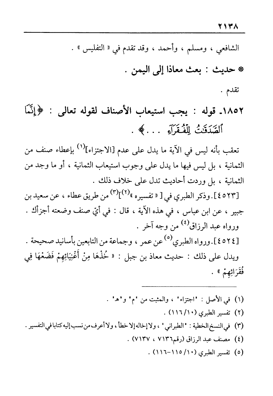 1852 - قوله: يجب استيعاب الأصناف لقوله تعالى: {إِنَّمَا الصَّدَقَاتُ لِلْفُقَرَاءِ ...}.