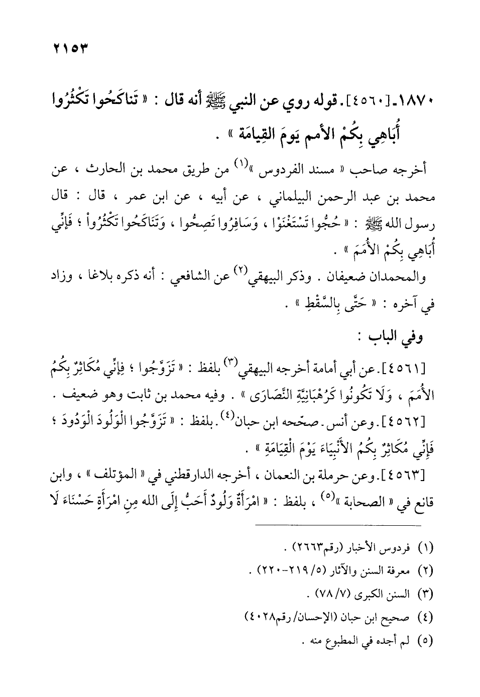 1870 - [4560]- قوله روي عن النبي - صلى الله عليه وسلم - أنه قال: "تَناكحُوا تَكْثُرُوا أُبَاهِي بِكُمْ الأمم يَومَ القِيامَة".