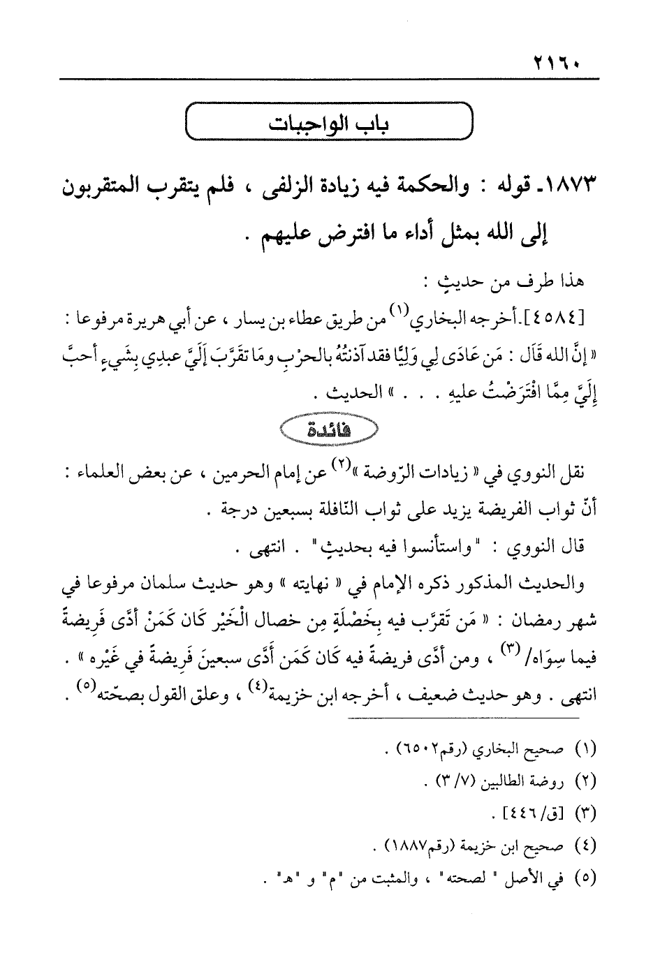 1873 - قوله: والحكمة فيه زيادة الزلفى، فلم يتقرب المتقربون إلى الله بمثل أداء ما افترض عليهم.