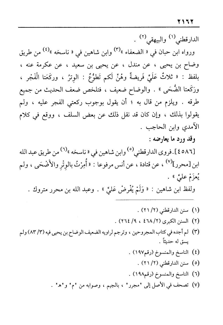 [4586]- فروى الدارقطني (¬5) وابن شاهين في "ناسخه" (¬6) من طريق عبد الله ابن [محرر] (¬7)، عن قتادة، عن أنس مرفوعًا: "أُمِرْتُ بالوِتْرِ والأَضْحَى، ولم يُعزَمْ عليَّ".