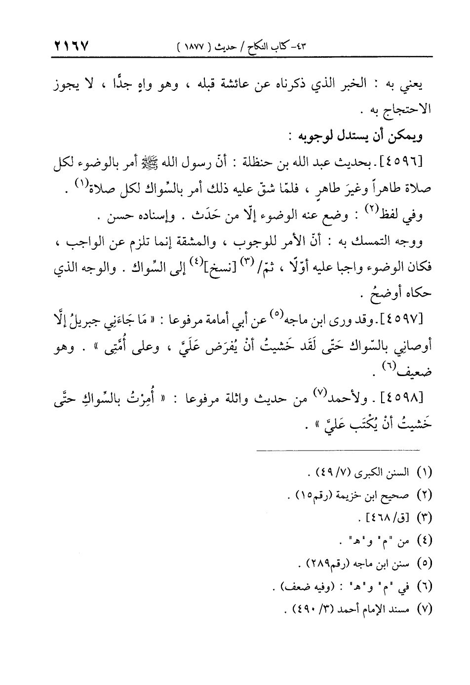 [4597]- وقد ورى ابن ماجه (¬5) عن أبي أمامة مرفوعًا: "مَا جَاءَنِي جبريلُ إلَّا أوصانِي بالسواك حَتى لَقَد خَشيتُ أنْ يُفرَض عَلَيَّ، وعلى أُمَّتِي". وهو ضعيف (¬6).