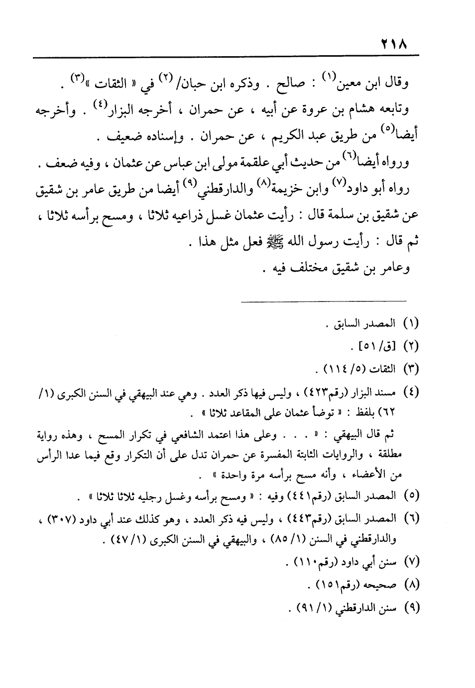 ثم قال البيهقي: " ... وعلى هذا اعتمد الشافعي في تكرار المسح، وهذه رواية مطلقة، والروايات الثابتة المفسرة عن حمران تدل على أن التكرار وقع فيما عدا الرأس من الأعضاء، وأنه مسح برأسه مرة واحدة"