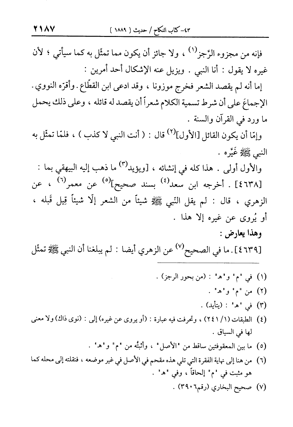 [4638]- أخرجه ابن سعد (¬4) بسند صحيح] (¬5) عن معمر (¬6)، عن الزهري، قال: لم يقل النبي - صلى الله عليه وسلم - شيئًا من الشعر إلا شيئًا قِيل قَبله، أو يُروى عن غيره إلا هذا.