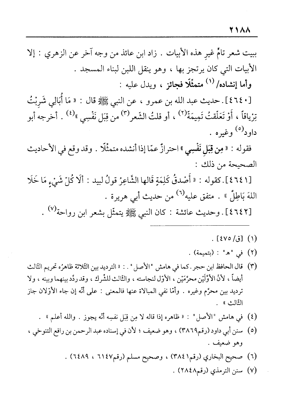 [4640]- حديث عبد الله بن عمرو، عن النبي - صلى الله عليه وسلم - قال: "مَا أُبَالِي شَرِبْتُ تِرْياقًا، أَوْ تَعَلّقتُ تَمِيمَةً (¬2)، أو قلتُ الشّعر (¬3) من قِبَل نَفْسِي" (¬4). أخرجه أبو داود (¬5) وغيره.