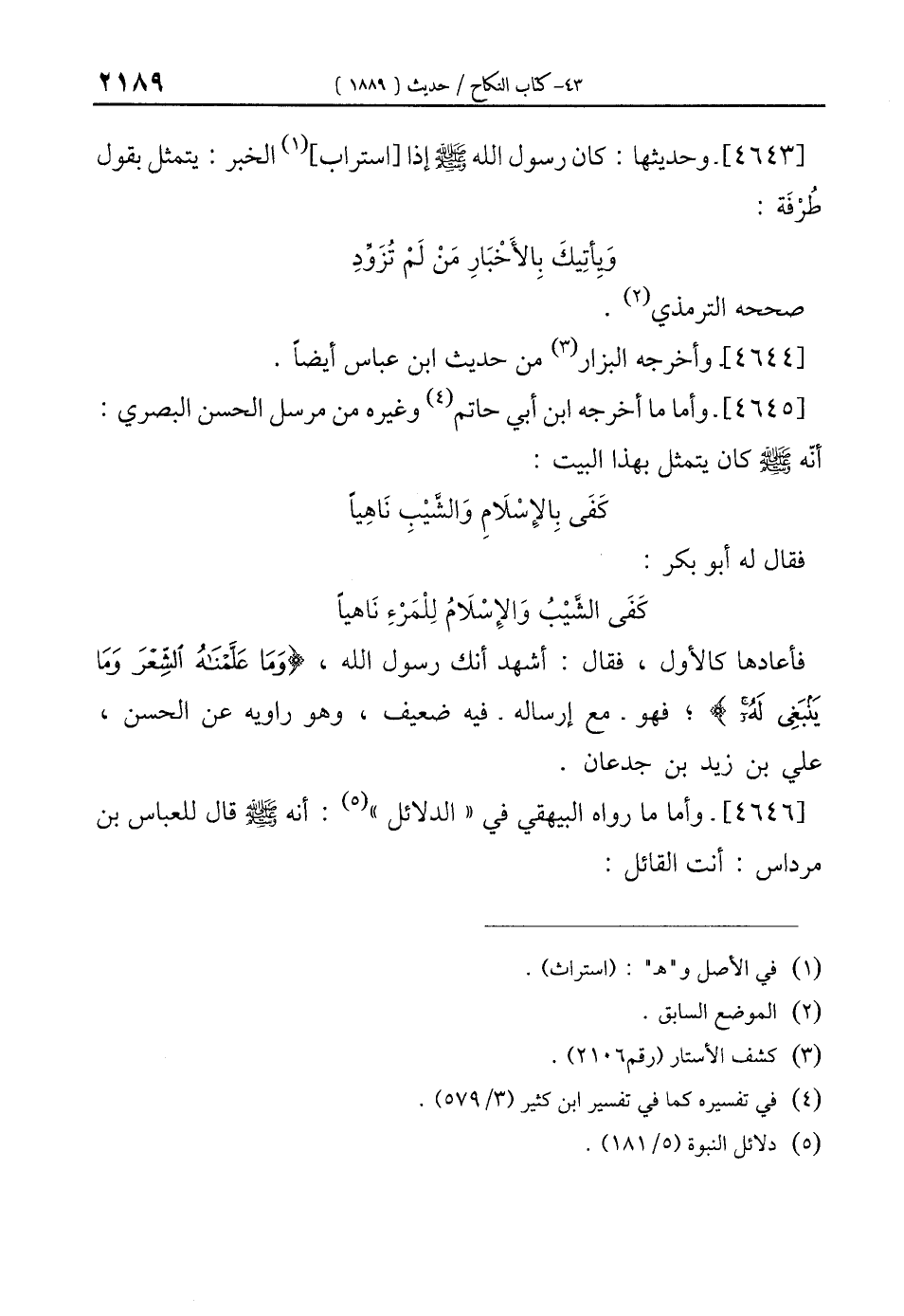 [4646]- وأما ما رواه البيهقي في "الدلائل" (¬5): أنه - صلى الله عليه وسلم - قال للعباس بن مرداس: أنت القائل: