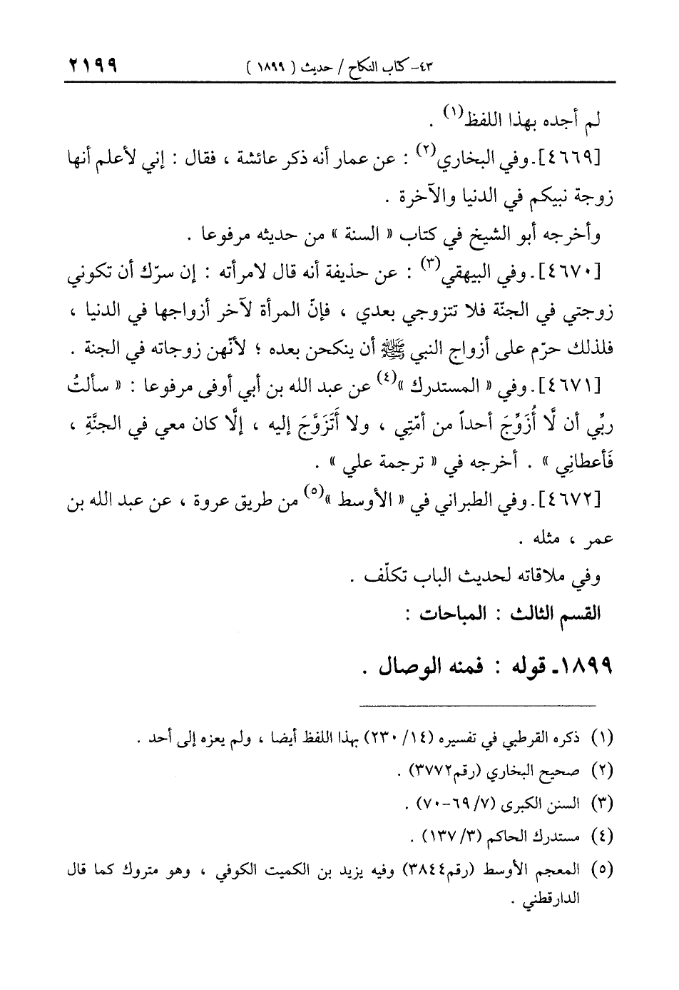 [4670]- وفي البيهقي (¬3): عن حذيفة أنه قال لامرأته: إن سرّك أن تكوني زوجتي في الجنّة فلا تتزوجي بعدي، فإن المرأة لآخر أزواجها في الدنيا، فلذلك حرّم على أزواج النبي - صلى الله عليه وسلم - أن ينكحن بعده؛ لأنّهن زوجاته في الجنة.
