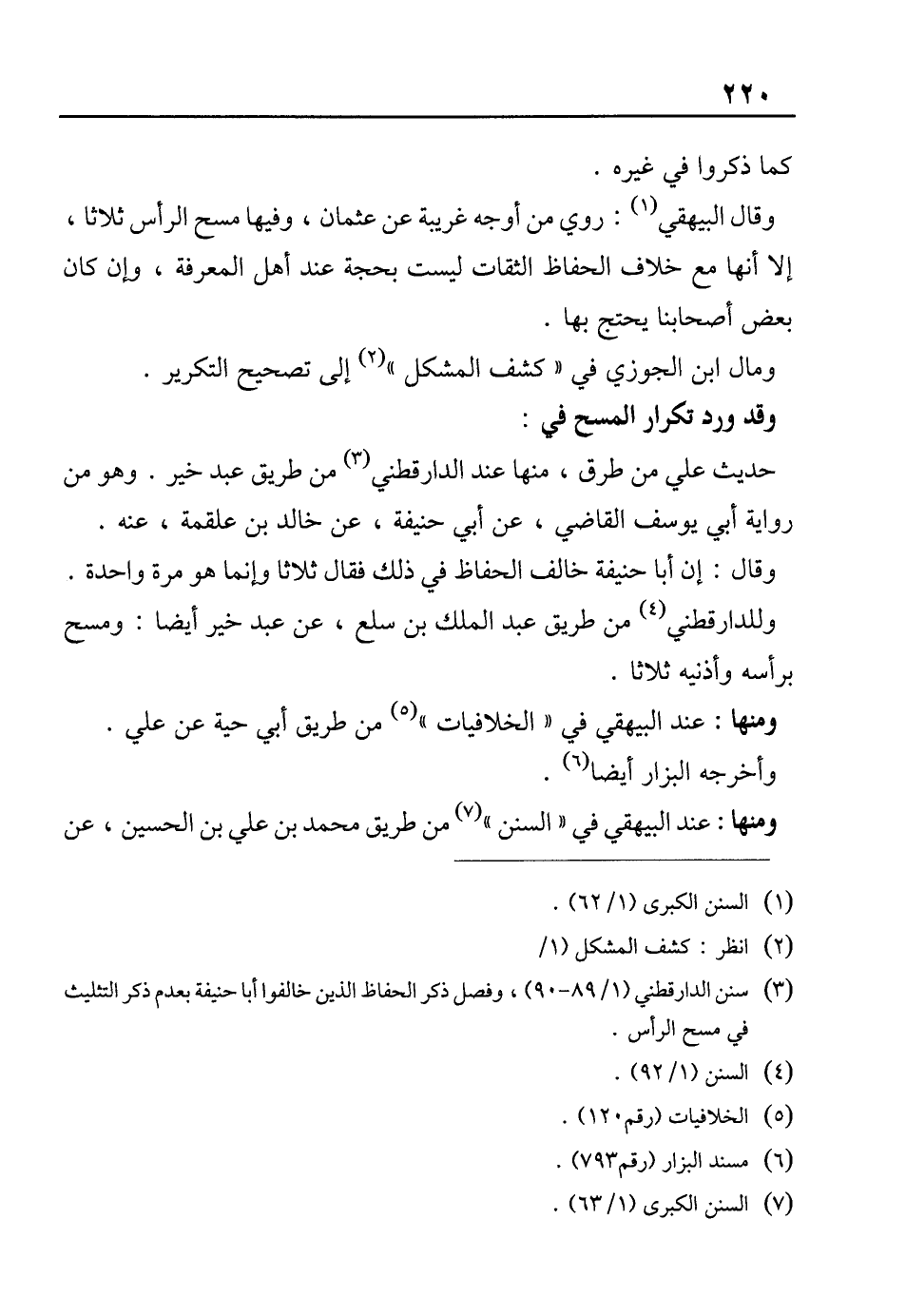 (¬3) سنن الدارقطني (1/ 89 - 95)، وفصل ذكر الحفاظ الذين خالفوا أبا حنيفة بعدم ذكر التثليث في مسح الرأس.