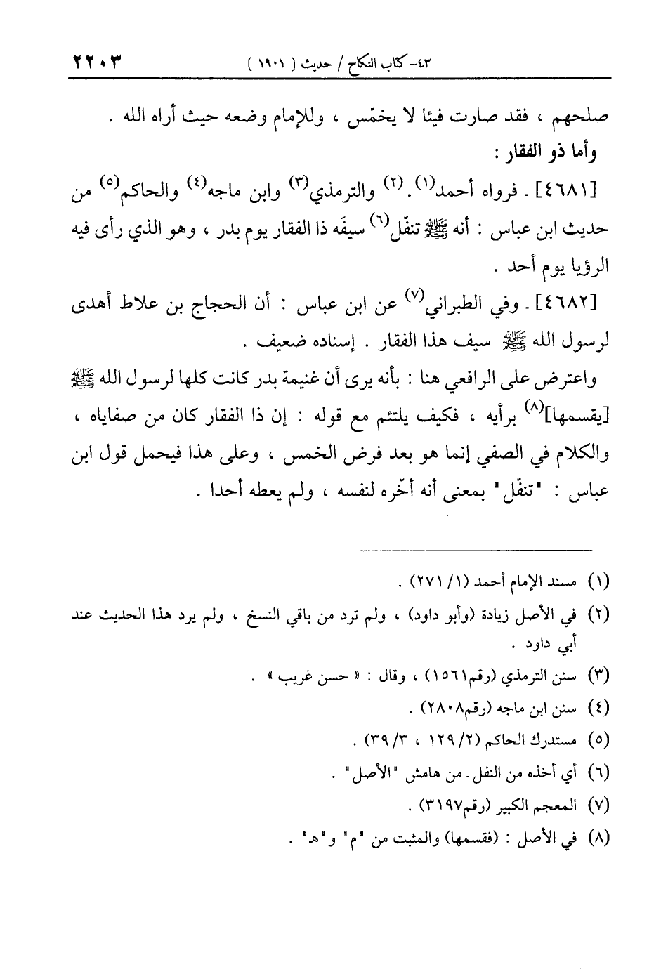 [4681]- فرواه أحمد (¬1) - (¬2) والترمذي (¬3) وابن ماجه (¬4) والحاكم (¬5) من حديث ابن عباس: أنه - صلى الله عليه وسلم - تنفّل (¬6) سيفَه ذا الفقار يوم بدر، وهو الذي رأى فيه الرؤيا يوم أحد.