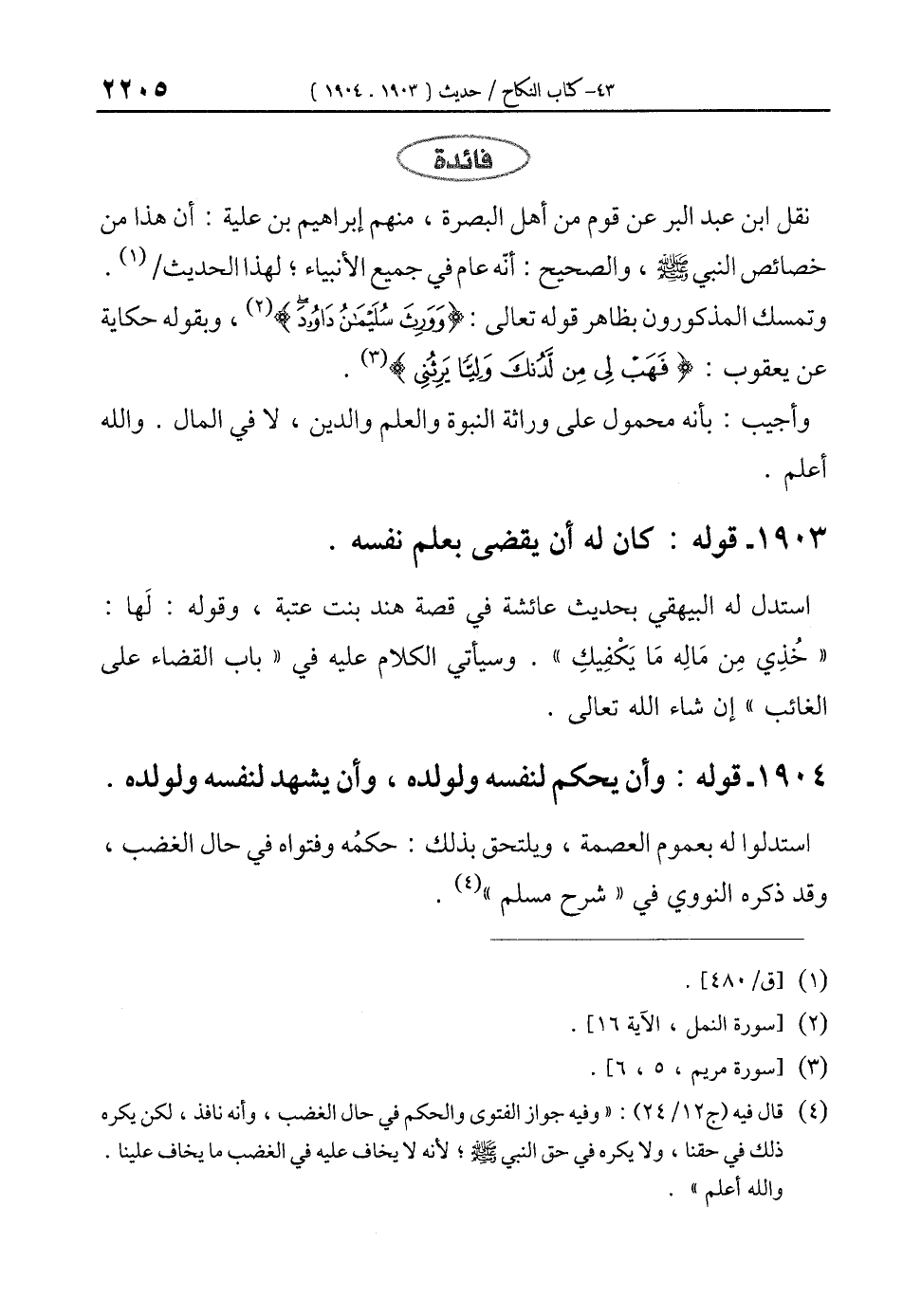 (¬4) قال فيه (ج 12/ 24): "وفيه جواز الفتوى والحكم في حال الغضب، وأنه نافذ، لكن يكره ذلك في حقنا, ولا يكره في حق النبي - صلى الله عليه وسلم -؛ لأنه لا يخاف عليه في الغضب ما يخاف علينا. والله أعلم".