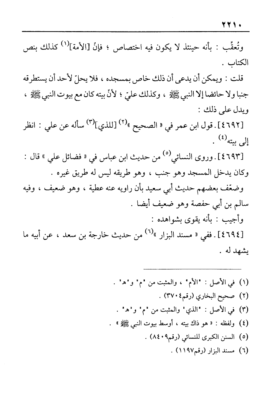 قلت: ويمكن أن يدعى أن ذلك خاص بمسجده، فلا يحلّ لأحد أن يستطرقه جنبا ولا حائضا إلا النبي - صلى الله عليه وسلم -، وكذلك علي؛ لأنّ بيته كان مع بيوت النبي - صلى الله عليه وسلم -، ويدل على ذلك: