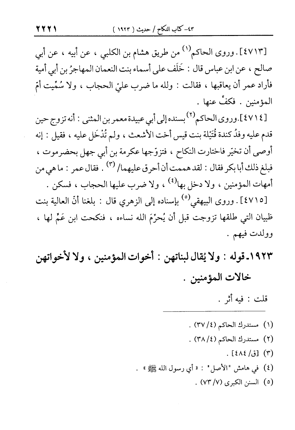 [4713]- وروى الحاكم (¬1) من طريق هشام بن الكلبي، عن أبيه، عن أبي صالح، عن ابن عباس قال: خَلَف على أسماء بنت النعمان المهاجرُ بن أبي أمية فأراد عمر أن يعاقبها، فقالت: ولله ما ضرب عليّ الحجاب، ولا سُمِّيت أم المؤمنين. فكفَّ عنها.