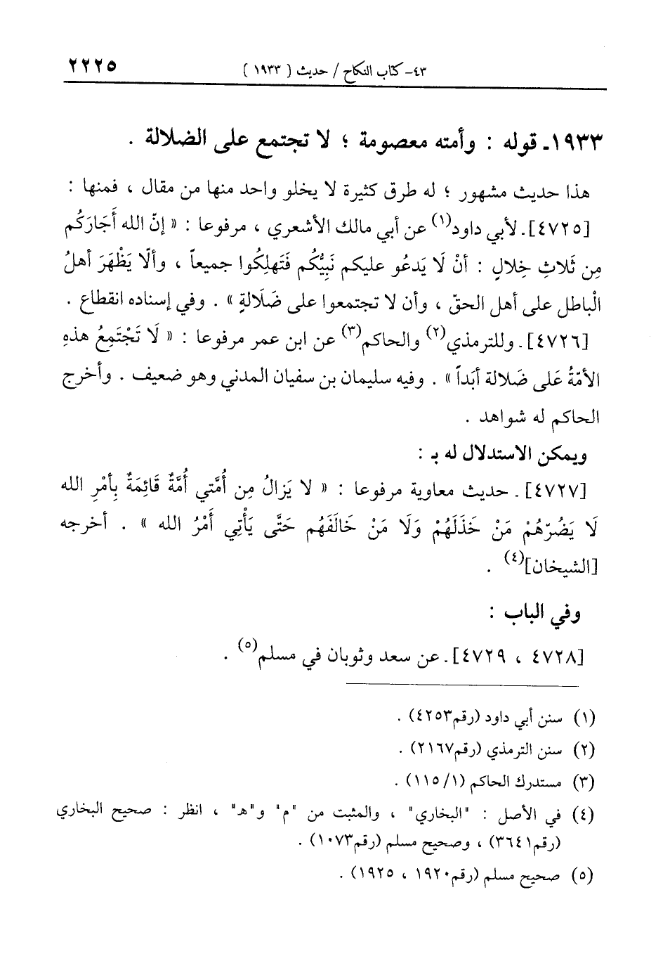 1933 - قوله: وأمته معصومة؛ لا تجتمع على الضلالة.