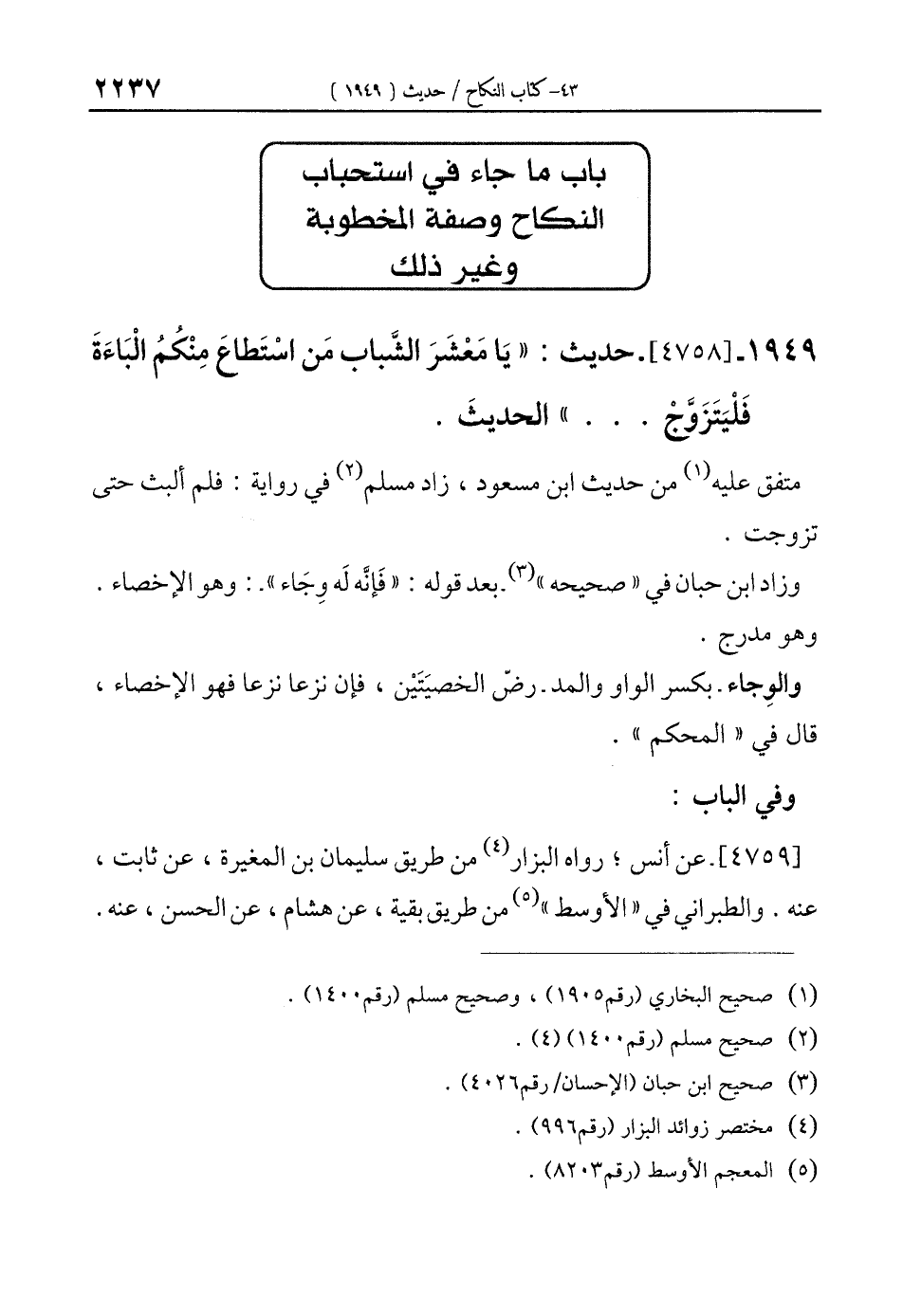 1949 - [4758]- حديث: "يَا مَعْشَرَ الشَّباب مَن اسْتَطاعَ مِنْكُمُ الْبَاءَةَ فَلْيَتَزَوَّجْ ... " الحديثَ.