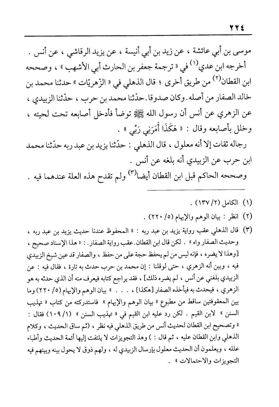 (¬3) قال الذهلي عقب رواية يزيد بن عبد ربه: "المحفوظ عندنا حديث يزيد بن عبد ربه، وحديث الصفار واه". لكن قال ابن القطان. عقب رواية الصفار -: "هذا الإسناد صحيح، [وهذا لا يضره، فإنه ليس من لم يحفظ حجة على من حفظ، والصفار قد عين شيخ الزبيدي فيه، وبين أنه الزهري، حتى لوقلنا: إن محمَّد بن حرب حدث به تارة، فقال فيه: عن الزبيدي بلغني عن أنس، لم يضره ذلك]، فقد يراجع كتابه فيعرف منه أن الذي حدثه به هو الزهري، فيحدث به فيأخذه الصفار [هكذا]، ... " بيان الوهم والإيهام (5/ 220) وما بين المعقوفتين ساقط من مطبوع "بيان الوهم والإيهام" فاستدركته من كتاب "تهذيب السنن" لابن القيم. لكن رد عليه ابن القيم في "تهذيب السنن" (1/ 109) فقال: "وتصحيح ابن القطان لحديث أنس من طريق الذهلي فيه نظر، (ثم ساق الحديث، وكلام الذهلي وابن القطان عليه، ثم قال:) وهذ التجويزات لا يلتفت إليها أئمة الحديث وأطباء علله، ويعلمون أن الحديث معلول بإرسال الزبيدي له، ولهم ذوق لا يحول بينه وبينهم فيه التجويزات والاحتمالات".