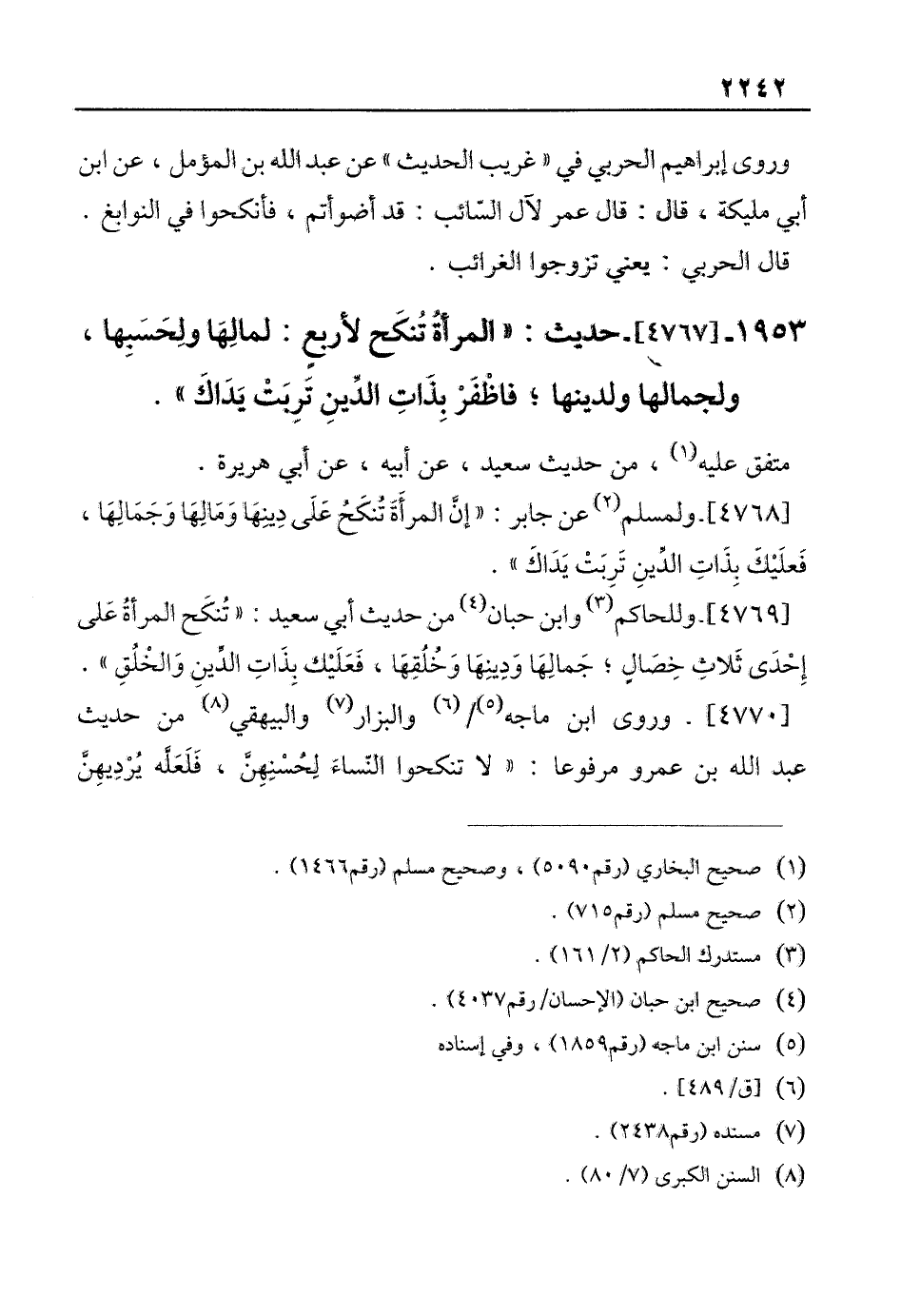 1953 - [4767]- حديث: "المرأةُ تُنكَح لأربعٍ: لمالِهَا ولِحَسَبِها، ولجمالها ولدينها؛ فاظْفَرْ بِذاتِ الدِّينِ تَرِبَتْ يَدَاكَ".