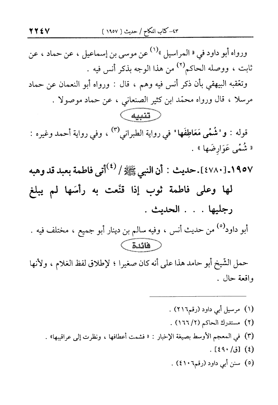 1957 - [4780]- حديث: أن النبي - صلى الله عليه وسلم - / (¬4) أتى فاطمة بعبد قد وهبه لها وعلى فاطمة ثوب إذا قنَّعت به رأسَها لم يبلغ رجليها ... الحديث.