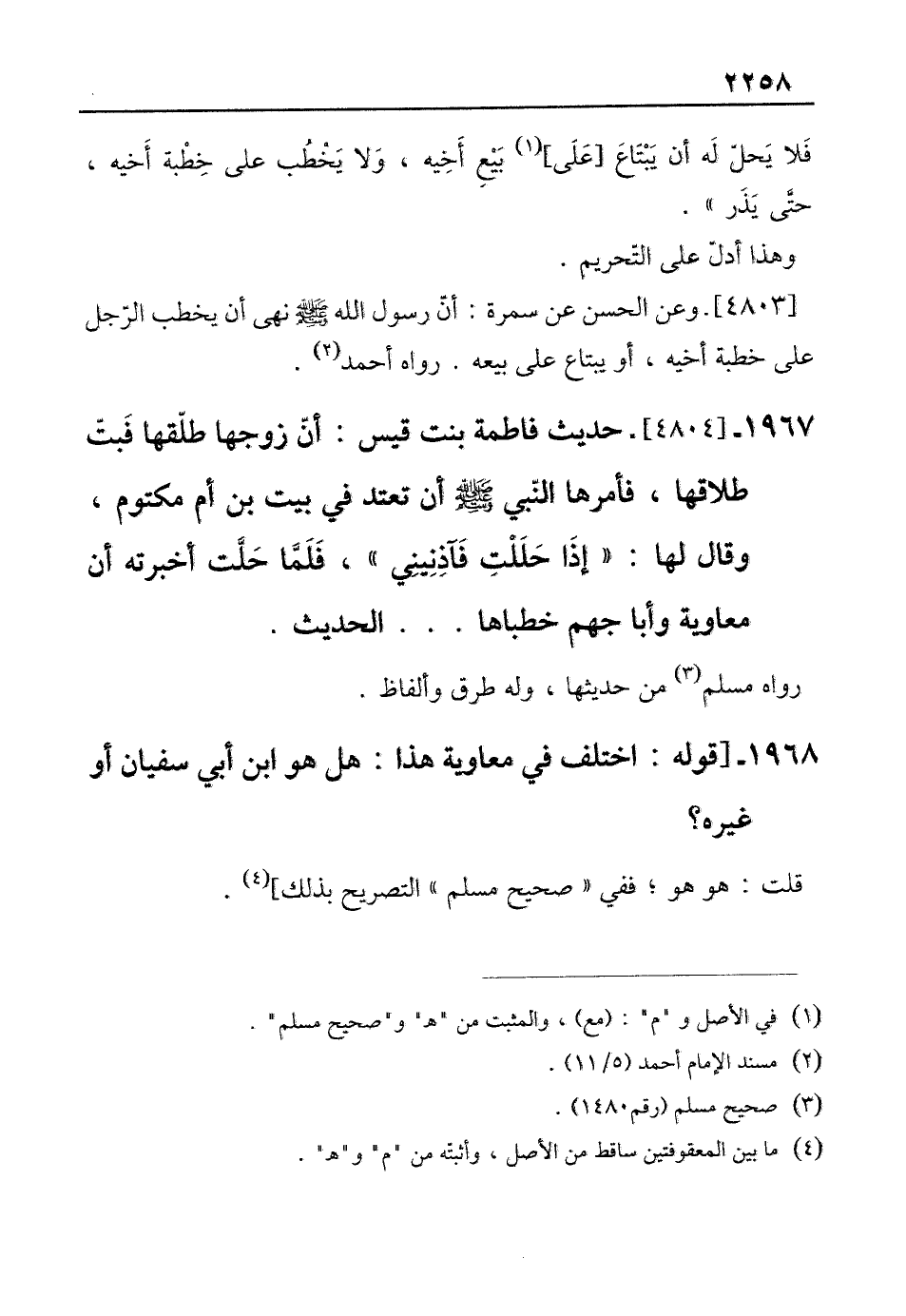 1967 - [4804]- حديث فاطمة بنت قيس: أنّ زوجها طلّقها فَبتّ طلاقها، فأمرها النبي - صلى الله عليه وسلم - أن تعتد في بيت بن أم مكتوم، وقال لها: "إذا حَلَلْتِ فَآذِنِينِي"، فلَمَّا حَلَّت أخبرته أن معاوية وأبا جهم خطباها ... الحديث.