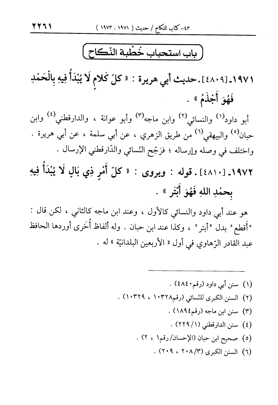 1971 - [4809]- حديث أبي هريرة: "كلّ كَلامٍ لاَ يُبْدَأُ فِيهِ بِالْحَمْدِ فَهُوَ أَجْذَمُ".