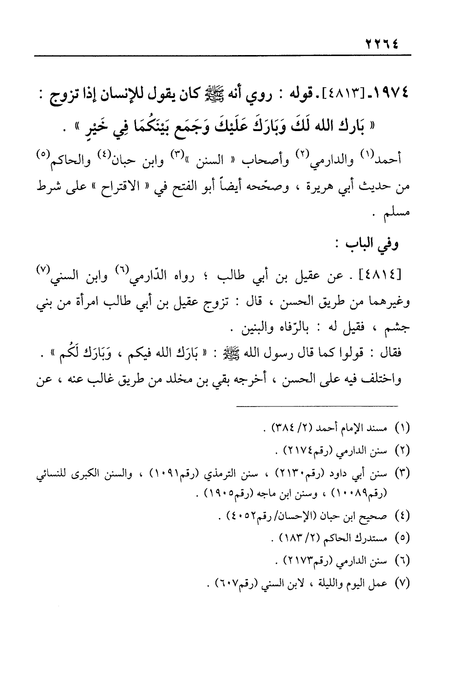 [4814]- عن عقيل بن أبي طالب؛ رواه الدّارمي (¬6) وابن السني (¬7) وغيرهما من طريق الحسن، قال: تزوج عقيل بن أبي طالب امرأة من بني جشم، فقيل له: بالرّفاه والبنين.