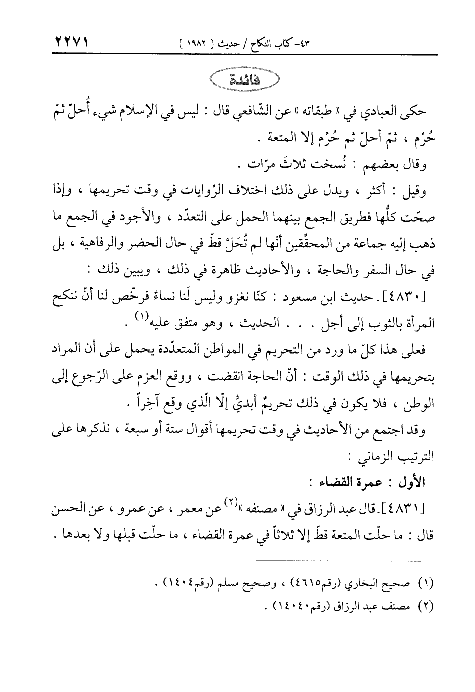 [4830]- حديث ابن مسعود: كنّا نغزو وليس لَنا نساءٌ فرخّص لنا أنّ ننكح المرأة بالثوب إلى أجل ... الحديث، وهو متفق عليه (¬1).
