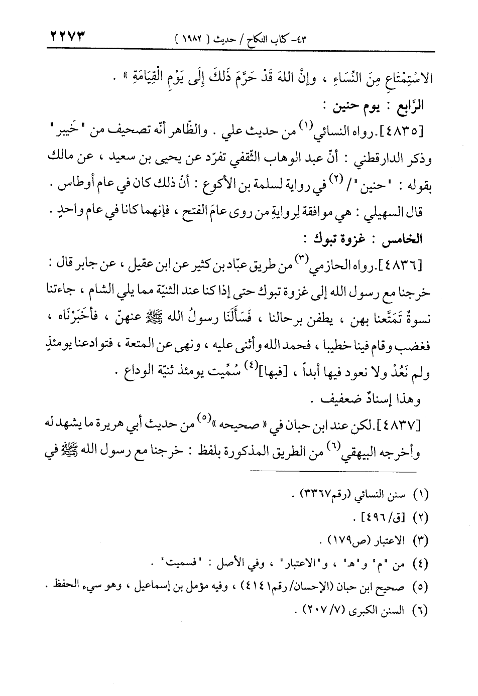 [4835]- رواه النسائي (¬1) من حديث علي. والظّاهر أنّه تصحيف من "خَيبر" وذكر الدارقطني: أنّ عبد الوهاب الثّقفي تفرّد عن يحيى بن سعيد، عن مالك بقوله: "حنين" (¬2) في رواية لسلمة بن الأكوع: أنّ ذلك كان في عام أوطاس. قال السهيلي: هي موافقة لِروايةِ من روى عامَ الفتح، فإنهما كانا في عام واحدٍ.