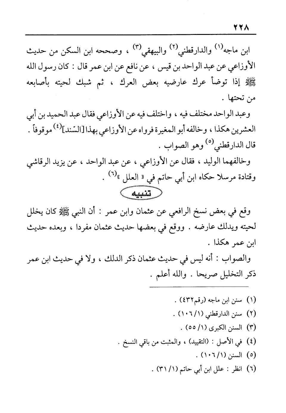 وقع في بعض نسخ الرافعي عن عثمان وابن عمر: أن النبي - صلى الله عليه وسلم - كان يخلل لحيته ويدلك عارضه. ووقع في بعضها حديث عثمان مفردا، وبعده حديث ابن عمر هكذا.